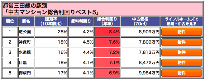 综合收益率最高的是与上涨率排行榜中同为第1的的芝公园站,综合收益可达8.4%。而第2名的是刚才介绍过的千代田区神保町站,综合收益率达7.6%。