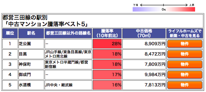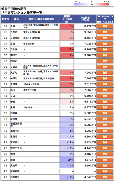 尽管排名第1的芝公园站二手公寓涨幅明显,但如果看整条线路的所有站台就会发现,有的站台周边二手公寓还会出现跌价的情形。