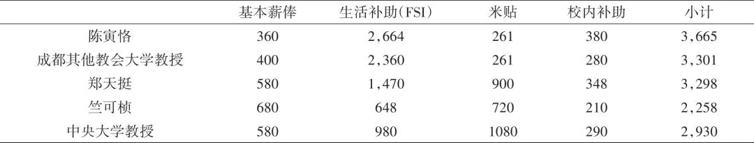 资料来源:陈寅恪数据见郭长城:《陈寅恪研究:新史料与新问题》,第39页;成都其他教会大学教授数据见《艾敷德致陈立夫函》(1943年9月16日),南京第二历史档案馆藏国民政府教育部档案,全宗号5,案卷号2557,教授薪俸系按顶薪计算;郑天挺数据见郑天挺:《郑天挺西南联大日记》下,第733页;竺可桢数据见竺可桢:《竺可桢日记》八,上海:上海科技教育出版社,2006年,第725—726页;中央大学教授系取薪俸580元者,根据相关薪津政策计算而来。