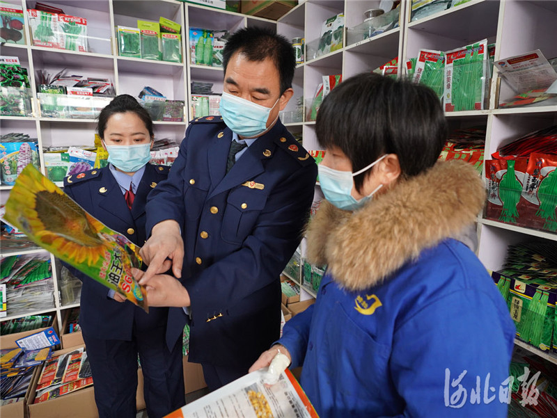 2021年3月15日,河北邢台市市场监督管理局开发区分局工作人员在一家农资门市检查种子质量 。河北日报记者 赵永辉摄影报道