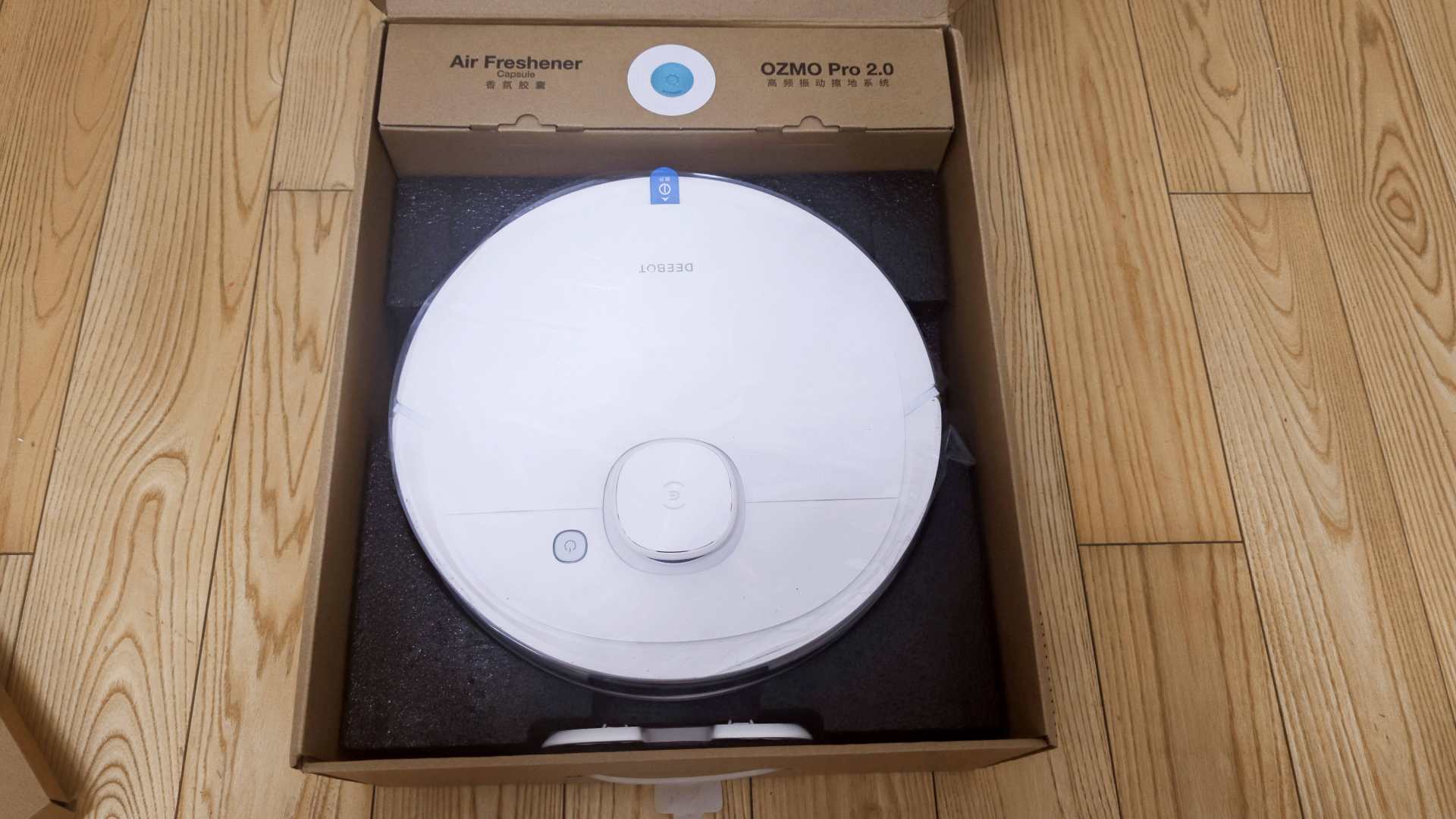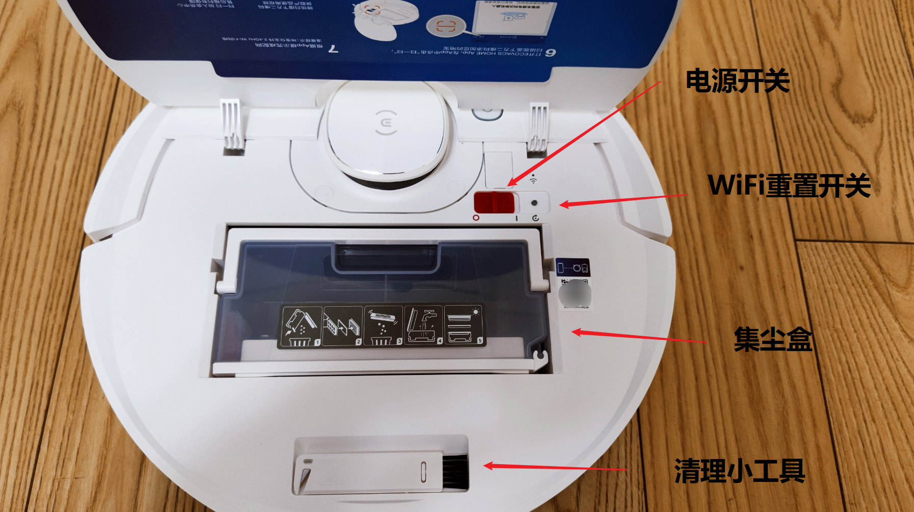 打开包装就能看到扫地机器人的本体,其他配件则都安排在下方。