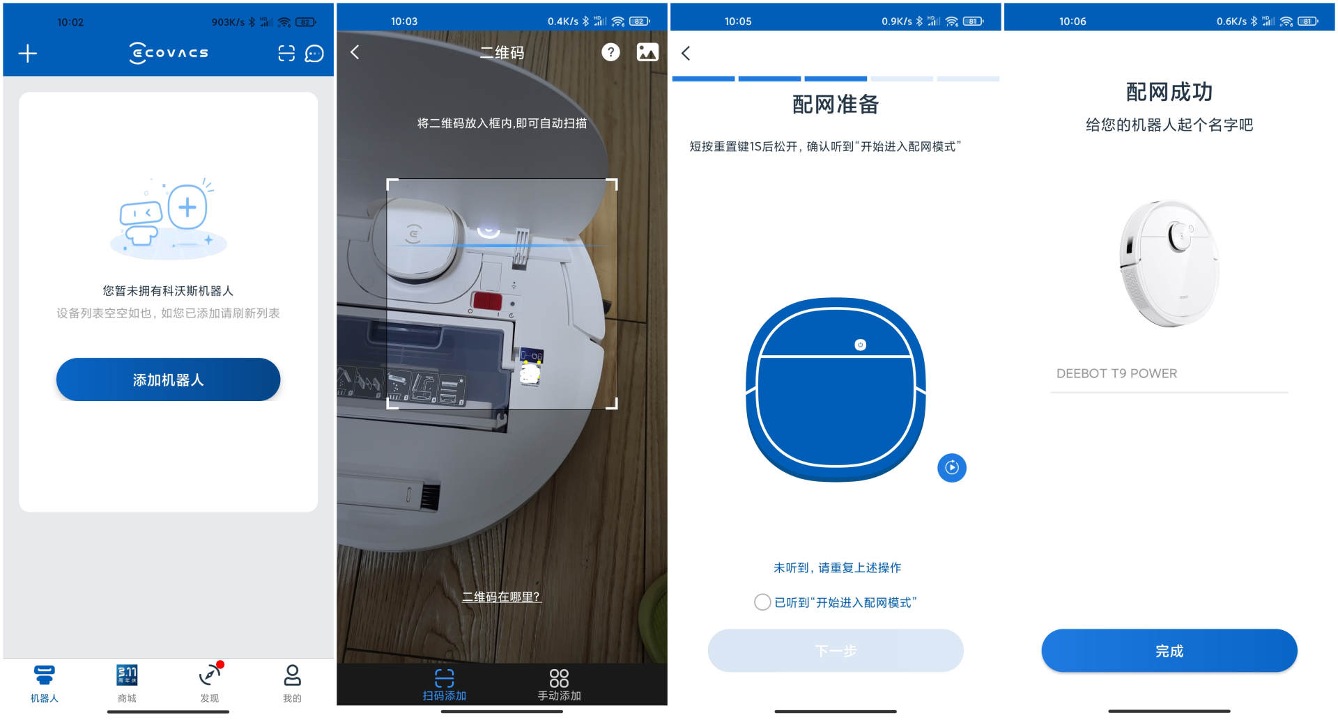 然后添加机器人>扫码机身上的二维码(WiFi连接标志处)>设备联网 ,整个配对过程非常顺利,一次成功。提示也设计的非常合理,基本一看就懂。试用过很多电器设备,感觉科沃斯产品在用户上手逻辑上还是用了心的。