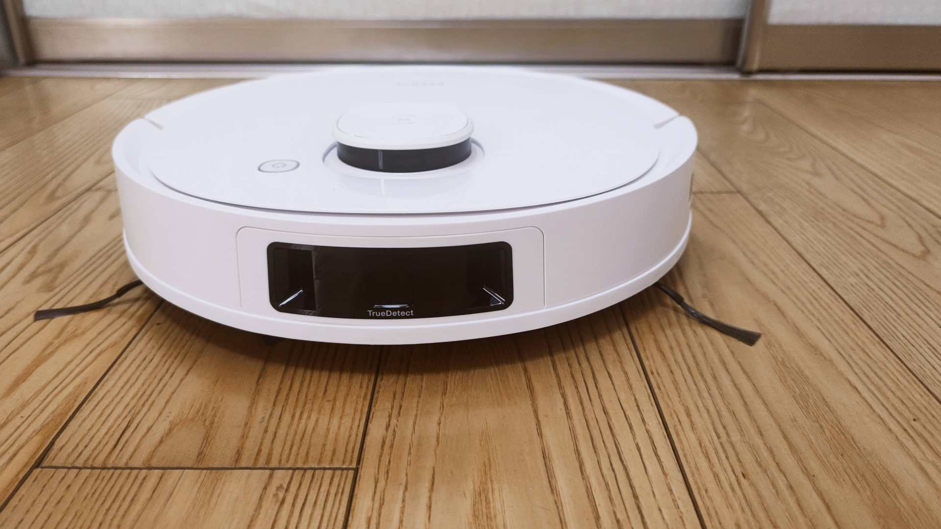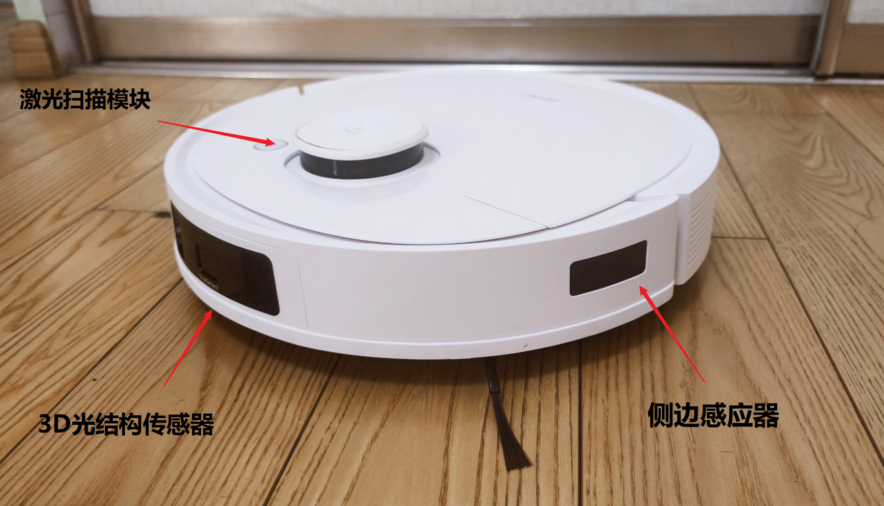 转到扫地机视角,可以清楚的科沃斯T9 Power的多个感应装置:正前方的激光扫描模块(据称采用了的dTOF飞行测距技术),前方底部的3D结构光传感器,两侧还各有一个感应器。借助这些感应器扫地机器人可以形成立体视觉,实现精准避障,扫地表现更加智能。具体表现我们会在下面的测评中展示。