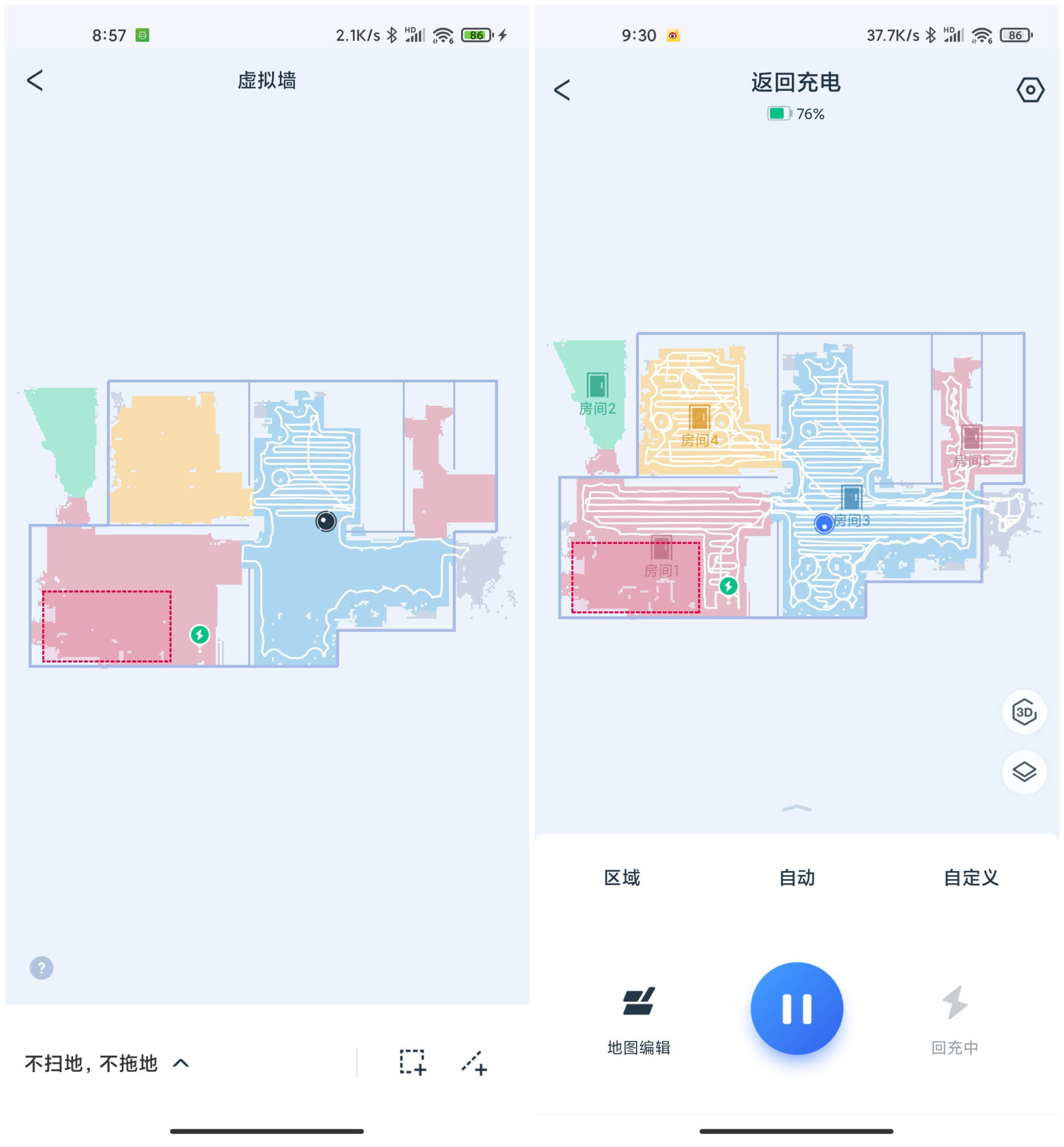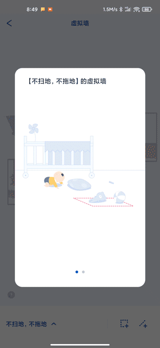 可以在地图上任意添加一块的区域设置虚拟墙,机器人在清扫时就不会打搅到这块区域。