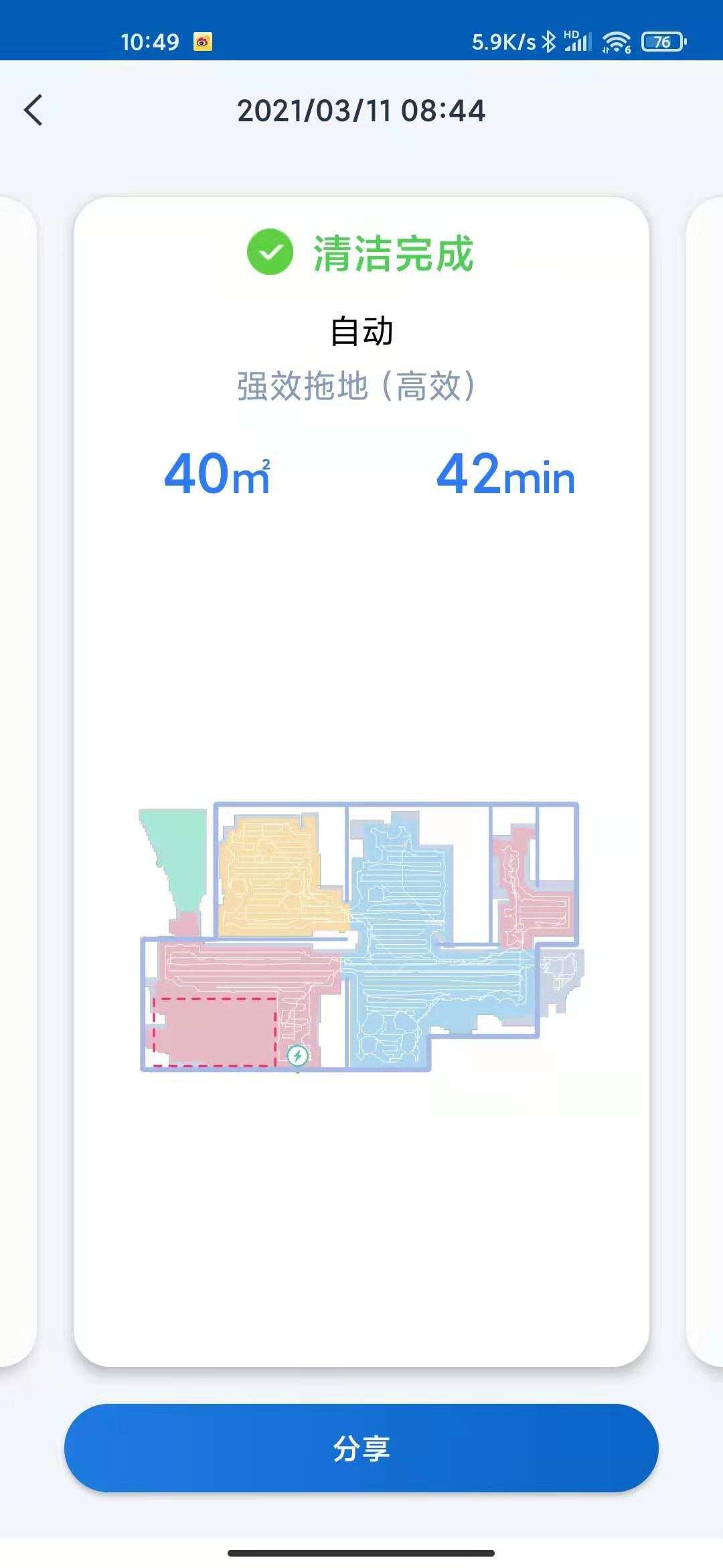 全屋拖地+清扫一次,耗时40分钟(设置了一块隔离区域)。整个房子拖完,水箱的水还剩一半左右。下次在程序中设置它“拖两遍”应该没什么问题。