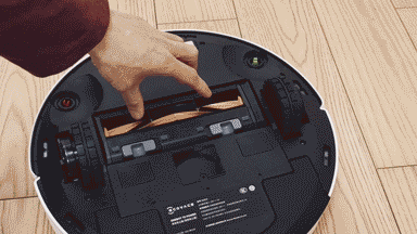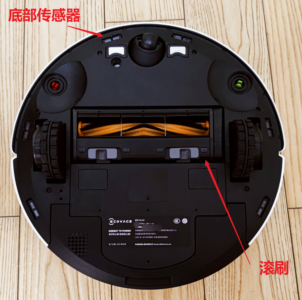 再把扫地机翻过来,可以看到底部还集成了六个灰尘传感器。还有扫地机的滚刷组件。