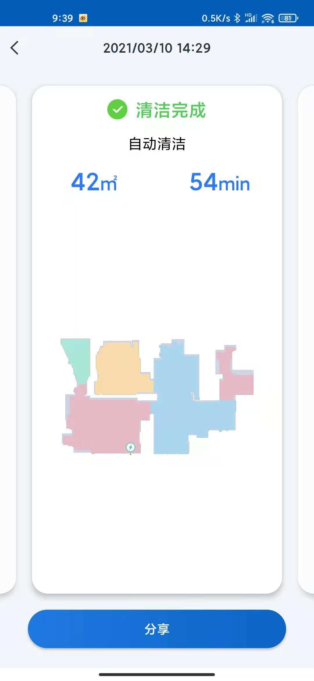 我家建筑面积不到90平,实际清扫面积42平米。首次清扫花费54分钟,耗电26%。按这么计算一次续航清扫个两三百平的大别墅一点问题都没有。来我家也算是屈才了!