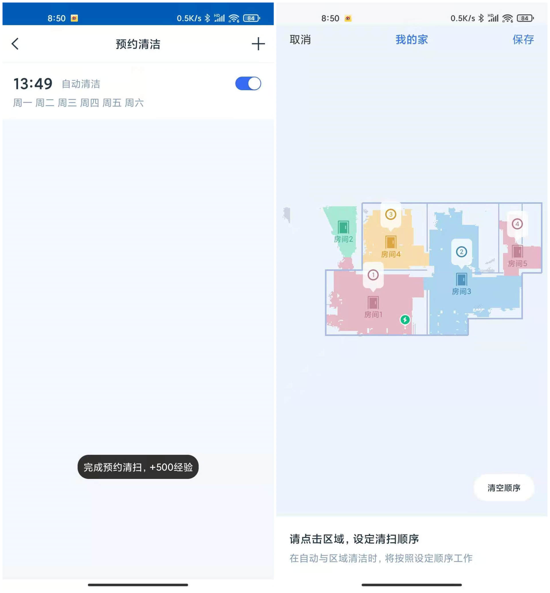 清洁设置方面给用户预留了非常丰富选项:不仅可以选择预约清扫,还可以设置打扫哪些区域,哪个房间先打扫哪个房间后打扫。