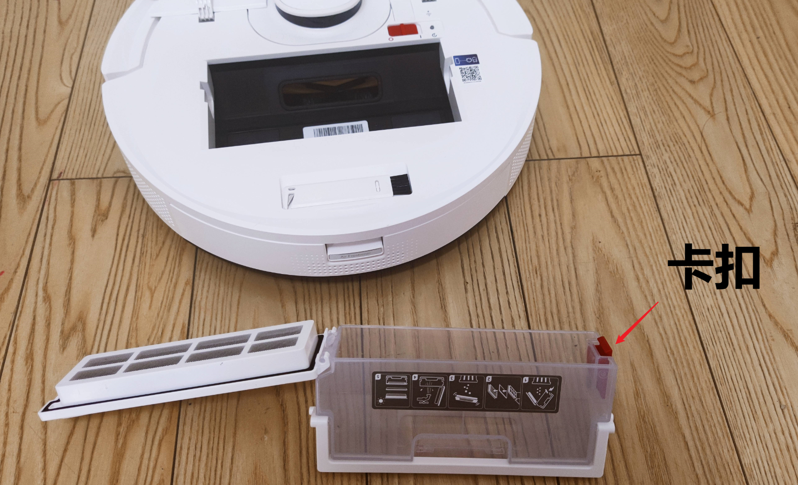 轻轻一压集尘盒右侧的卡扣就能将合盖打开,平时我们就从这里把垃圾倒出。