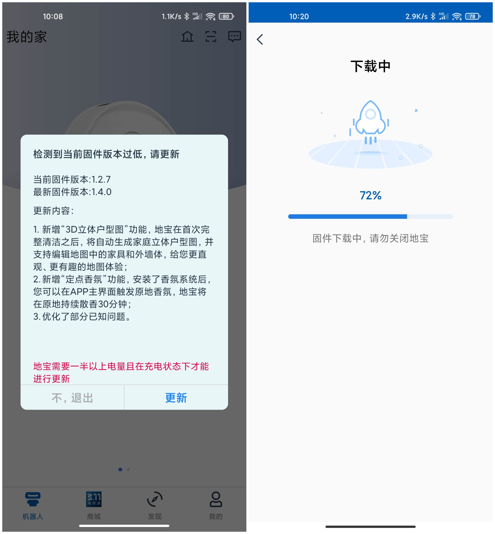 刚刚联网成功又经历了一次固件更新,才算可以真正使用。固件更新时必须把扫地机放在充电座上,并且有一半以上的电量。