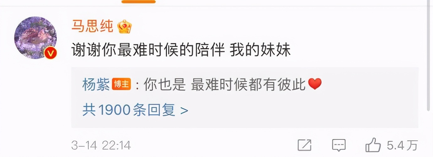 吃瓜群众都惊呆了,这两个人,啥时候这么熟了,尤其是马思纯的表白——“最难时候的陪伴”,大概率,说的是她跟抑郁症正面刚的时刻吧。可是完全没人知道,陪着马思纯走出抑郁症的,竟然是杨紫。