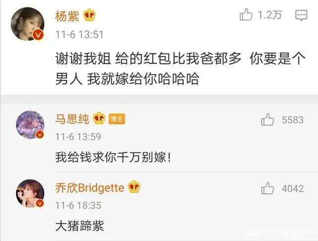 之前杨紫过生日,马思纯说没祝她生日快乐,只是发了红包,杨紫开心地呦,说马思纯的红包比她爸给的都多,如果马思纯是个男人,自己一定要嫁给她。