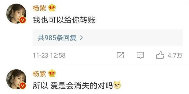 结果杨紫立马冲出来捍卫主权对乔欣说:我也可以给你转账。