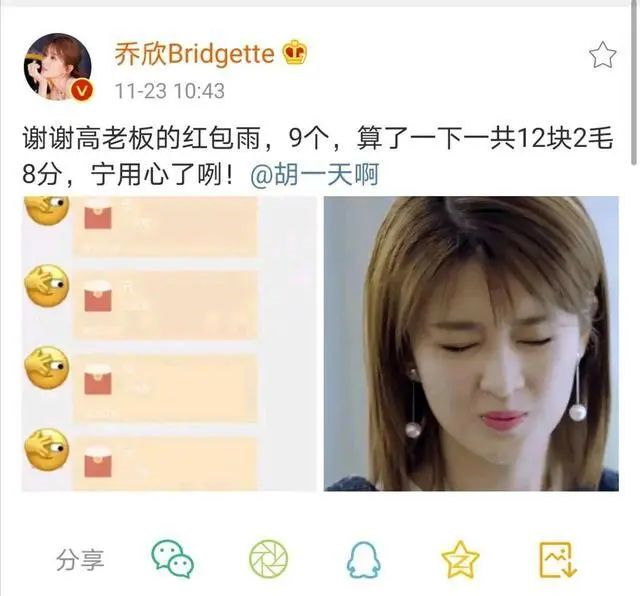 之前乔欣过生日,跟她一起合作《小风暴》的搭档胡一天豪气连发9个红包,凑成一句:林总生日快乐,你最美!