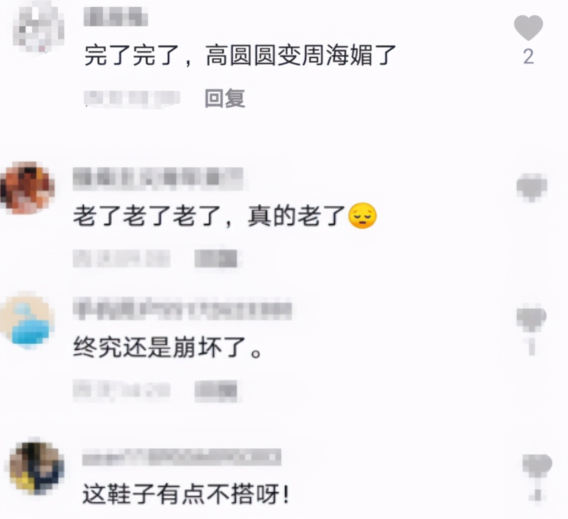 连这届网友也不为情怀买账,纷纷在评论中表示说终究还是崩坏了,高圆圆变周海媚,惋惜地感叹高圆圆老了老了,真的老了;也有眼尖的网友发现,高圆圆穿的鞋子是高跟鞋,太出戏了,有点不搭。