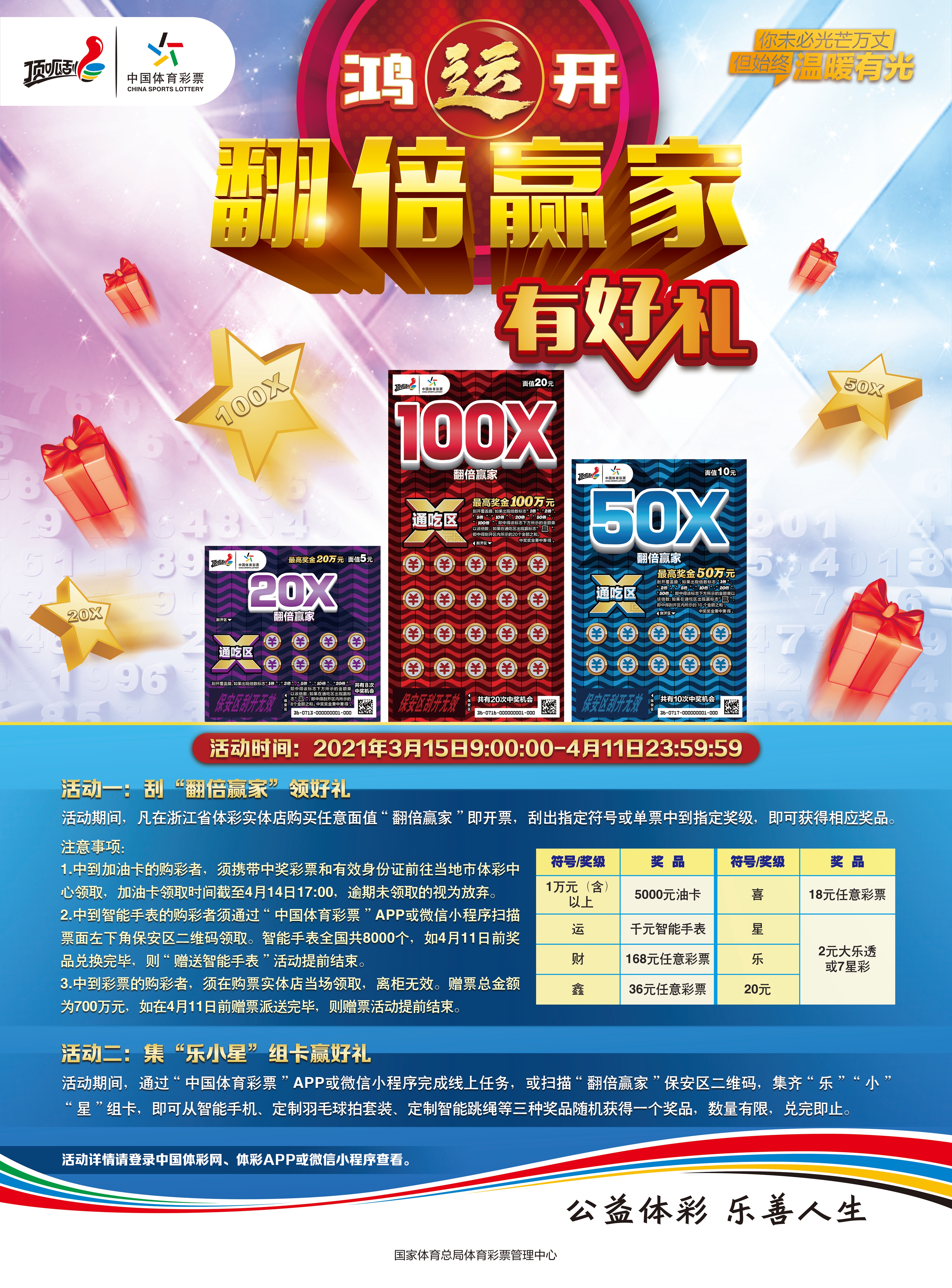 活动期间,凡在浙江体彩实体店,购买任意面值“翻倍赢家”即开票,单票中出1万元及以上奖级,就能获得5000元中石化油卡。如在票面预设的“通吃区”内,刮出“运”字标志,即可通过“中国体育彩票”APP或微信小程序登录活动页面扫描保安区二维码,领取智能手表一块,活动期间将送出8000块智能手表。如刮出“财”,就能获得168元任意体育彩票;如刮出“鑫”,就能获得36元任意体育彩票;如刮出“喜”,就能获得18元任意体育彩票;如刮出“星”或“乐”,或单票中出20元奖级,就能获得2元大乐透或7星彩彩票。赠票总金额700万元。