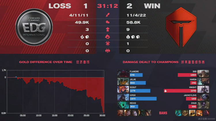五千万的阵容在春季赛期间拿到过八连胜,一度成为LPL赛区中最被看到的一支队伍。但随着其他一些队伍状态慢慢调整过来,EDG也是吃下了三场败仗,其中有一场就输给了TES。