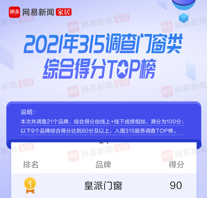 在本次315家居服务调查的21家门窗品牌中,皇派以90分位列第一名。