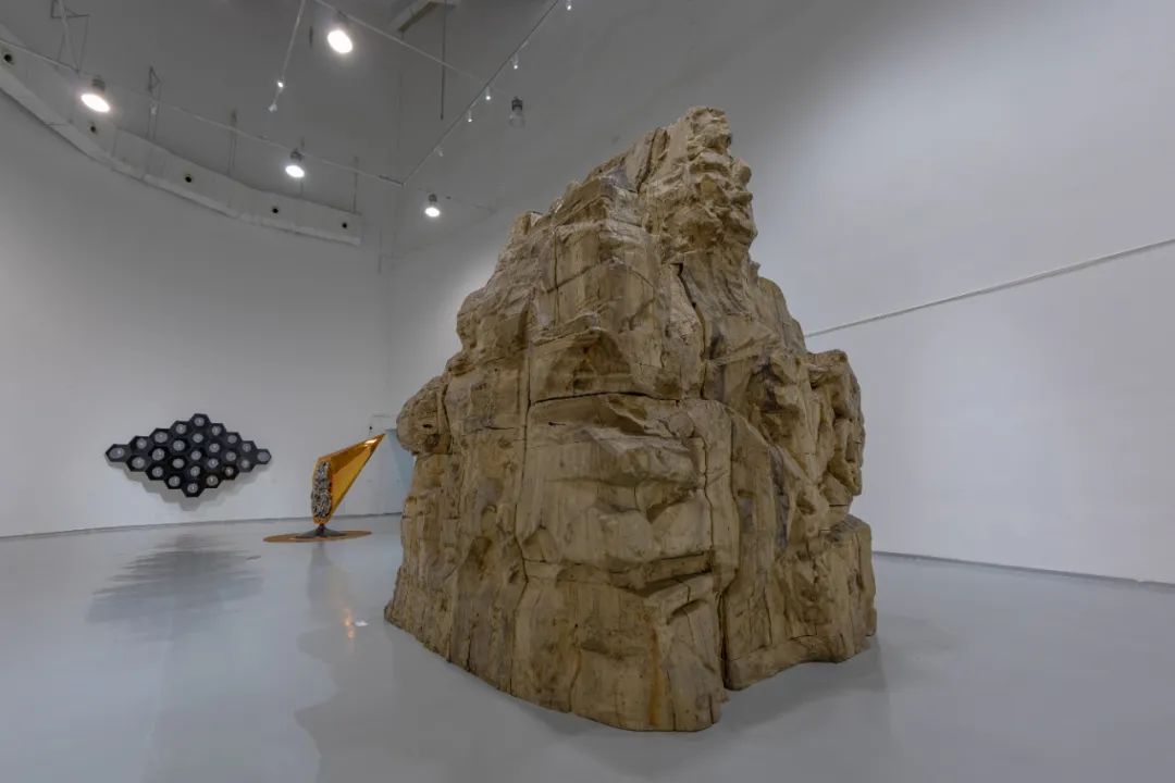 ▲ 展览现场,陈曦作品《正在显形》,双面樟木雕刻,高4米,直径3米,2018,苏州金鸡湖美术馆