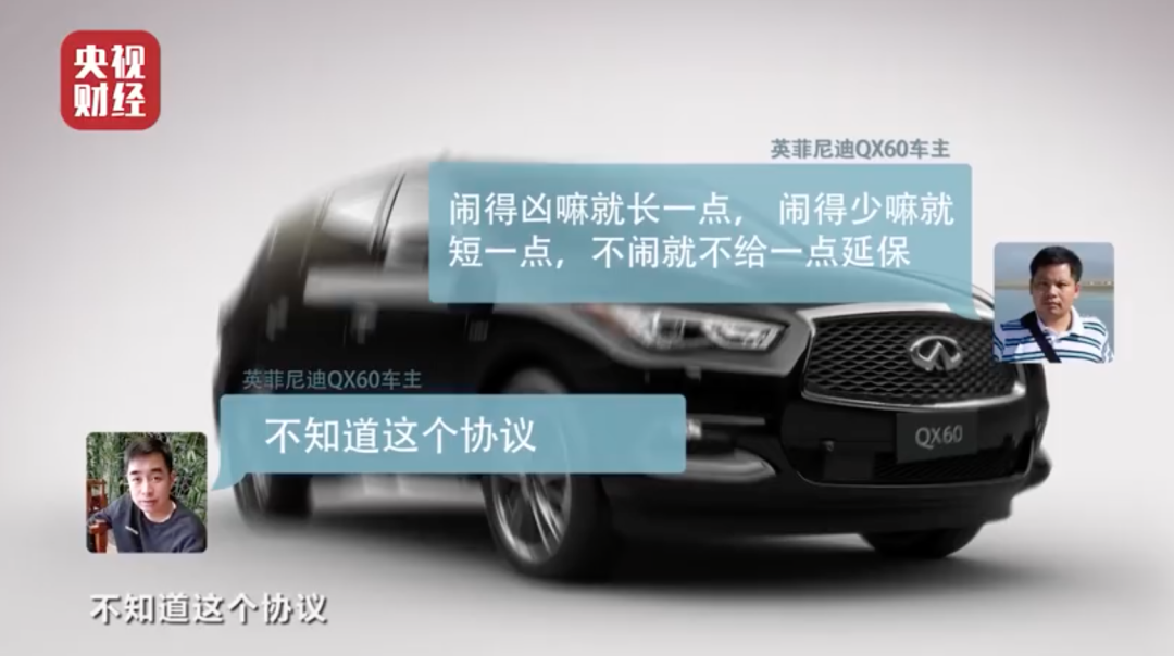 英菲尼迪4S店和车主签署的延保从2年到20年不等,延保期限取决于车主维权的力度。有车主表示,闹得凶就长一点、闹得少就短一点、不闹就不延保,有车主认为这个协议不是个封口费吗?