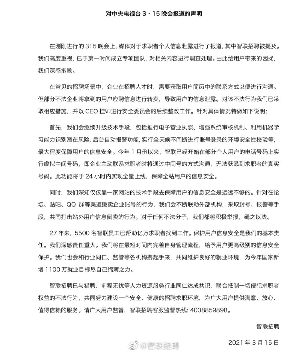 智联招聘官方微博3月16日表示,在常见的招聘场景中,企业在招聘人才时,需要获取用户简历中的联系方式以便进行沟通。但部分不法企业将拿到的用户应聘信息进行转卖导致用户的信息泄露。对该不法行为智联招聘已采取相应措施,并以CEO挂帅进行安全委员会的后续整改工作。