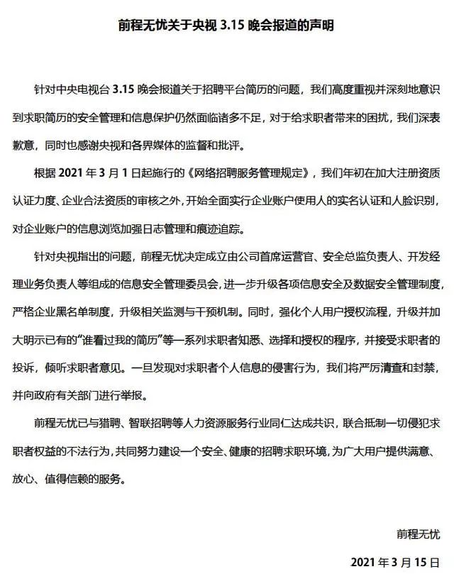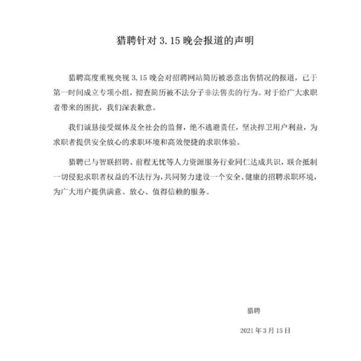 央视“3·15”晚会曝光招聘平台简历被售卖问题后,猎聘、前程无忧、智联招聘相继在深夜公开道歉。