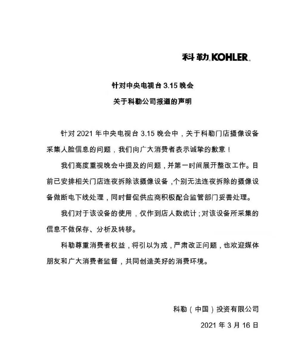 16日早上7点40分,科勒(中国)投资有限公司就央视315晚会中,关于科勒门店摄像设备采集人脸信息发布致歉声明。科勒公司表示已安排相关门店连夜拆除摄像设备。