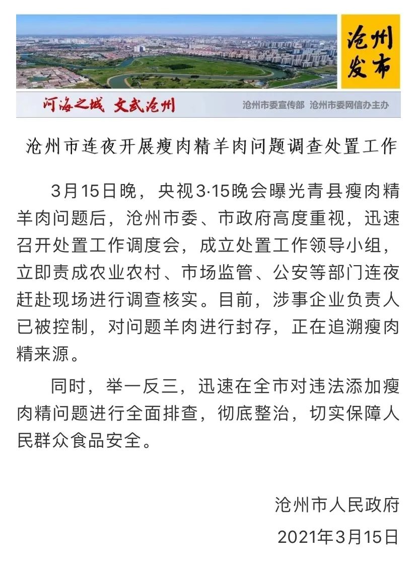 据沧州市人民政府微信公众号“沧州发布”发布最新消息称:目前,涉事企业负责人已被控制,对问题羊肉进行封存,正在追溯瘦肉精来源。