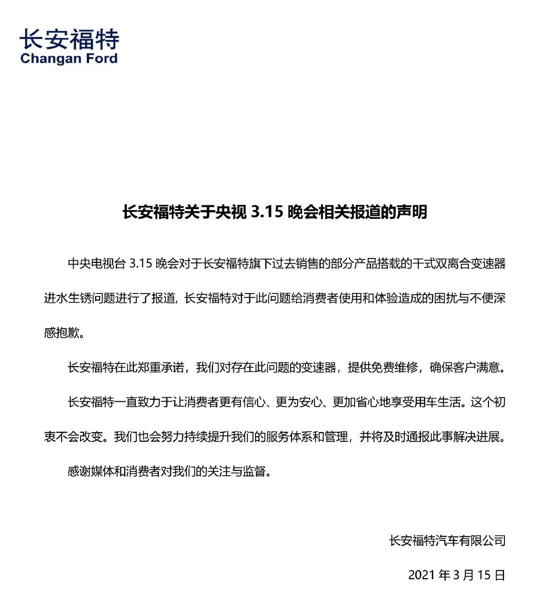 3月15日晚间,针对央视3·15晚会曝光福特汽车变速箱生锈,长安福特发布声明称:中央电视台3·15晚会对于长安福特旗下过去销售的部分产品搭载的干式双离合变速器进水生锈问题进行了报道,长安福特对于此问题给消费者使用和体验造成的困扰与不便深感抱歉。