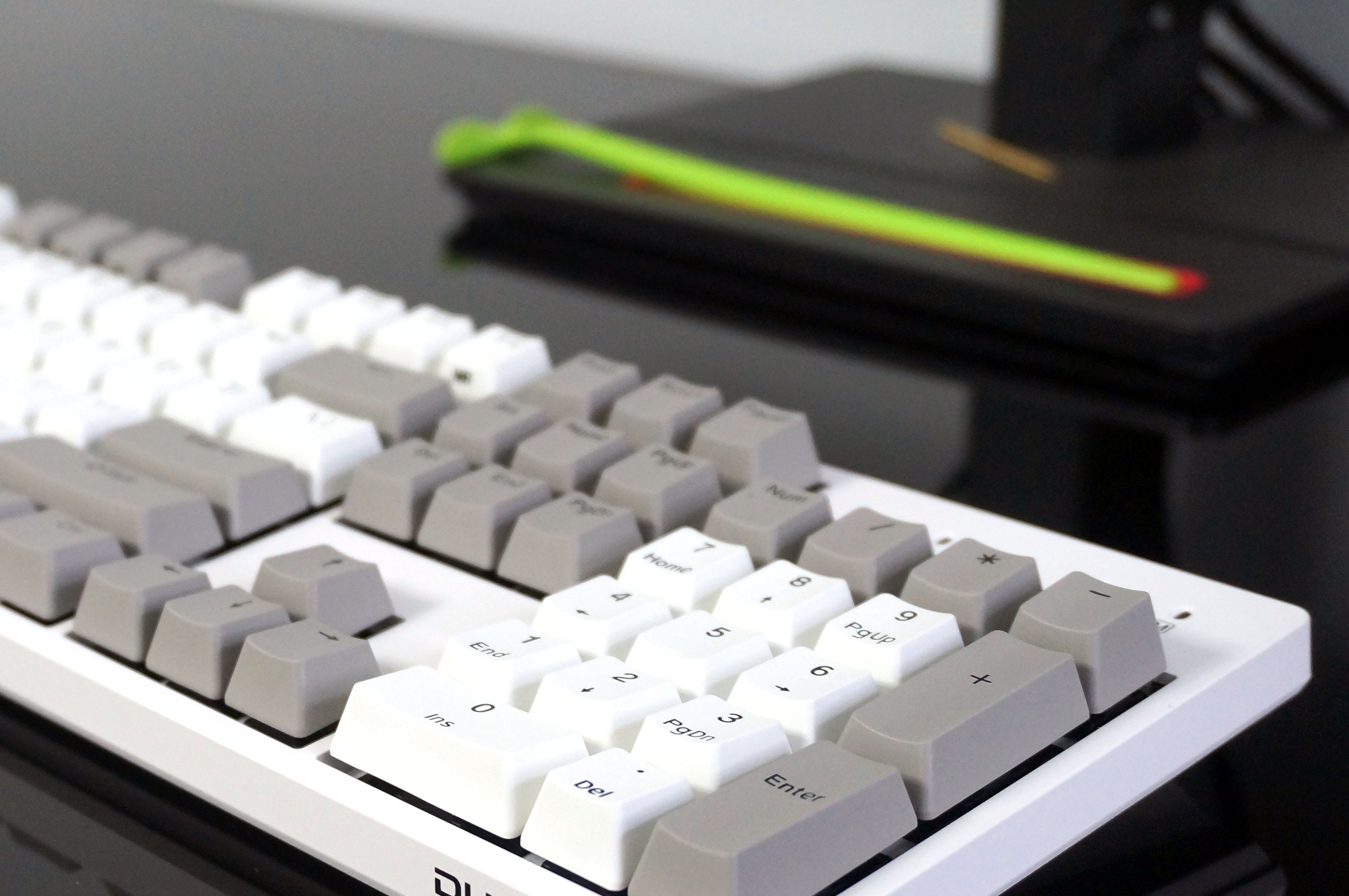 整个键盘表面都是非常规整的,数字键上有一些是两种操作字符的,不过排列和设计也并不突兀。因为键帽采用的是原厂高度双色闭口字体键帽,所以打字输入接触的时候感觉会更加舒服;高含量PBT材质会更加耐用而且不容易打油。