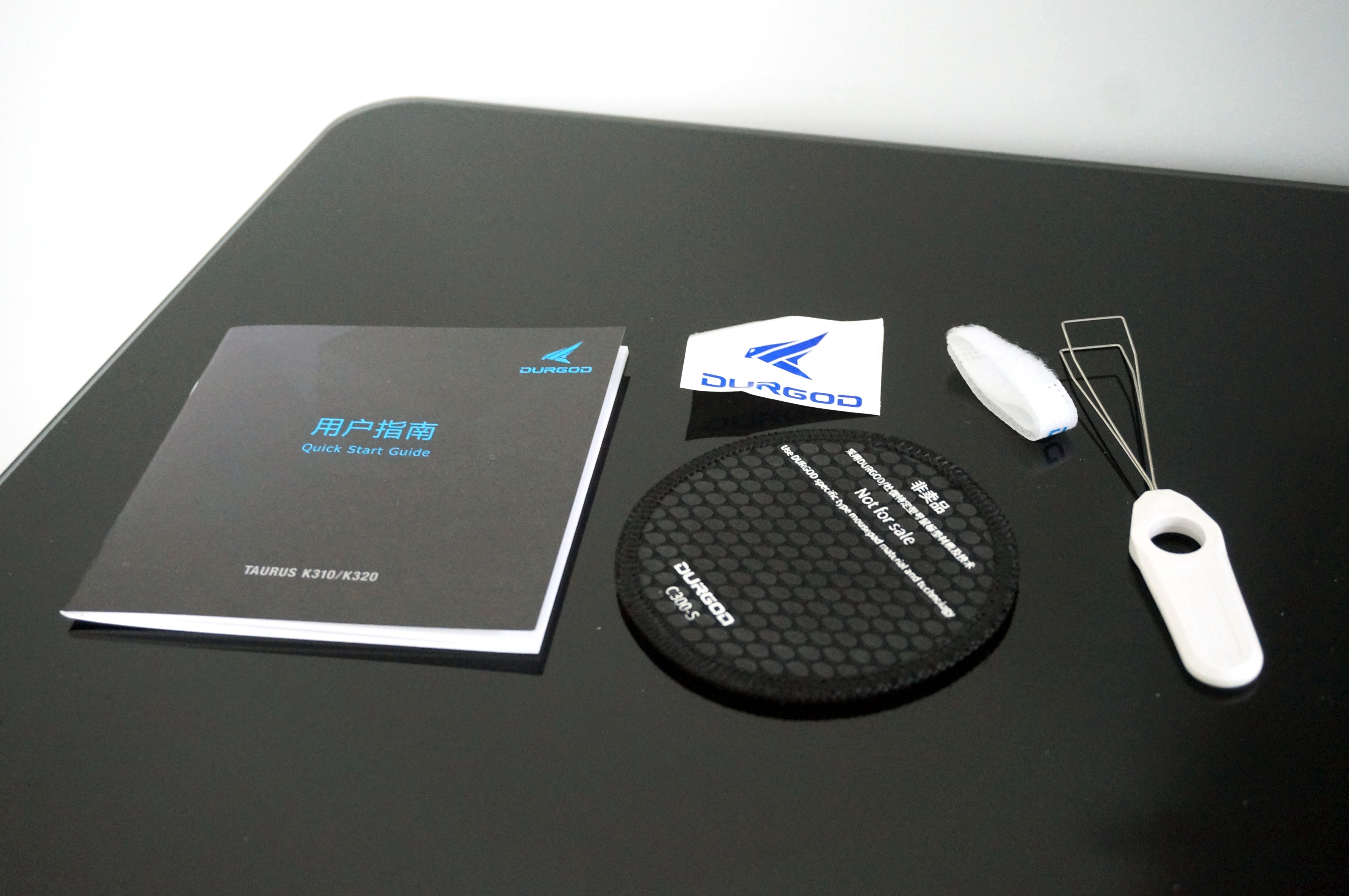 打开包装盒,可以看到有两个小的配件在上面,下面就是键盘主机。把全部的配件取出来可以看到:零碎的配件包括防尘罩*1、用户指南*1 、杯垫*1、收纳魔术贴*1、拔键器*1。然后,主要的配件包括杜伽K310机械键盘*1、USB-C to USB-A 数据线*1和USB-C to USB-C 数据线*1。