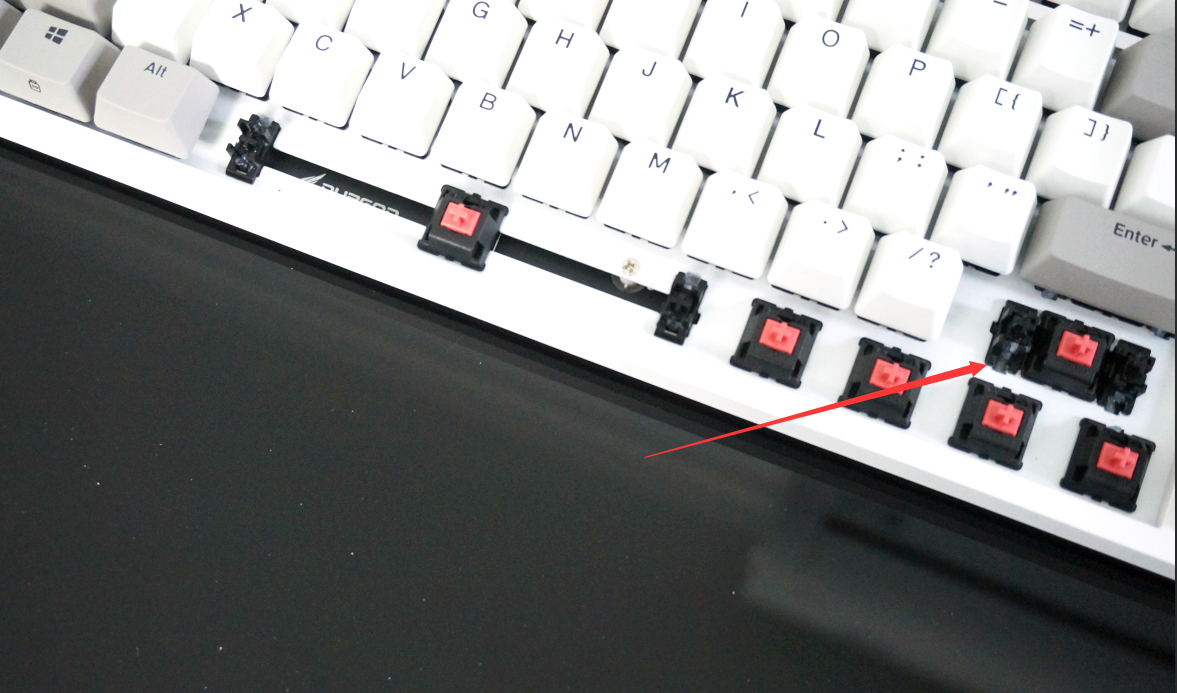杜伽K310的全部键帽都是在一块钢板上的,为了保障输入时候更好的效果,针对不同大小的键位都有不一样的设计。使用拔键器拔出来一些键位可以看到,小的键位就是单轴体,大的键位就是卫星轴设计,有辅助的平衡轴可以保证你不管按压在哪个地方就可以更快更稳的输入。
