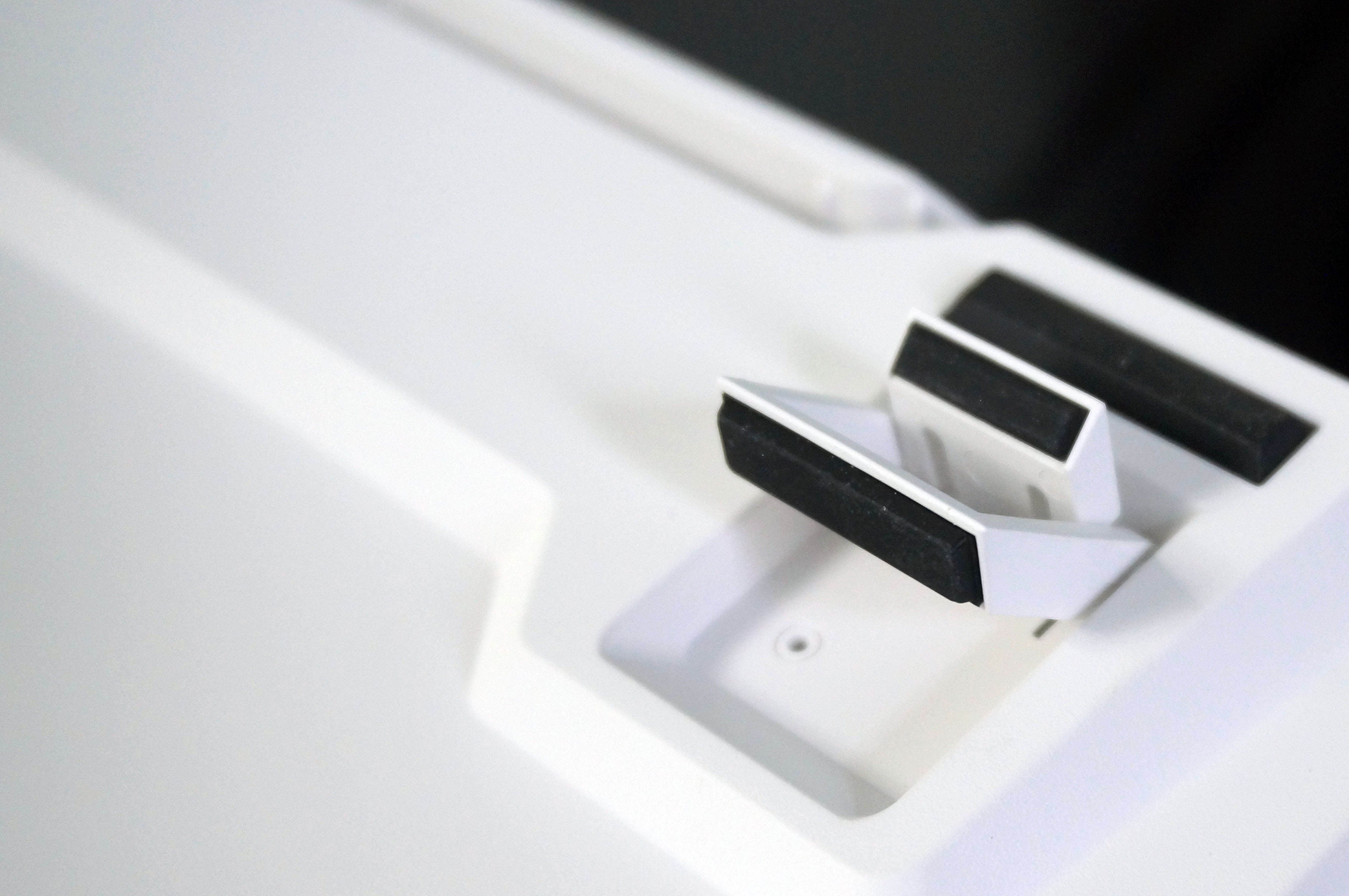 键盘的背面设计相对就比较经典了,背面统一都是白色,加强了键盘的整体感。然后工艺上使用了磨砂,摸上去就能感受到精致。四个角都有一个小小的防滑垫,用来增强设备放置时候的稳定性。