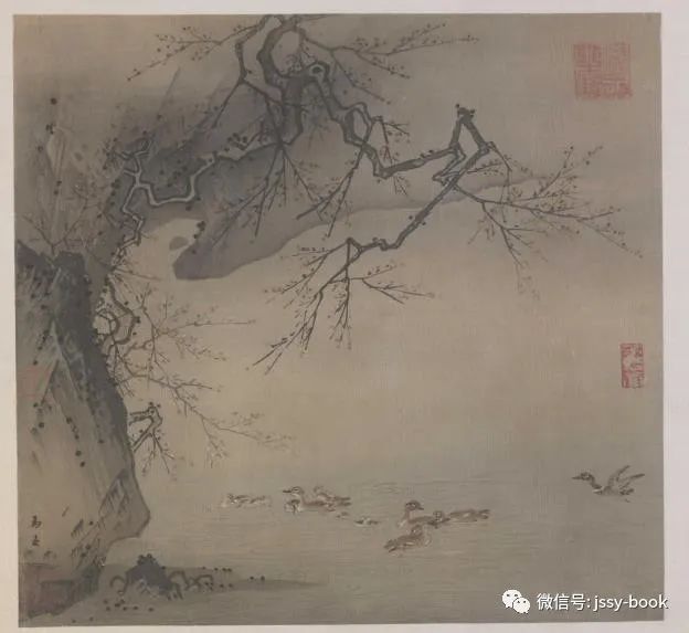 梅石溪凫图,26.7X28.6厘米,北京故宫博物院收藏。画面采用对角线式构图,正是山不见巅、树不见顶的边角截景。该副图款署“马远”。钤藏印:“ 潞王宝”、“茅林心赏”、“阿蒙”、“于腾私印”。画面左上方是立于水中的峭壁一角,近处山石运用典型的大斧劈皴法,清刚猛烈,简练概括,尖梢处如铁钉一般尖利峭拔。远处坡石则先用重墨勾出轮廓,再用水笔迅速渲染、晕淡,一遍成形,产生微妙的明暗过渡。这种画法不同于南宗山水的层层积染。