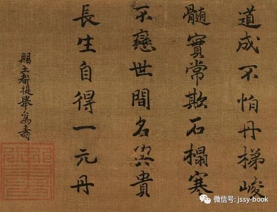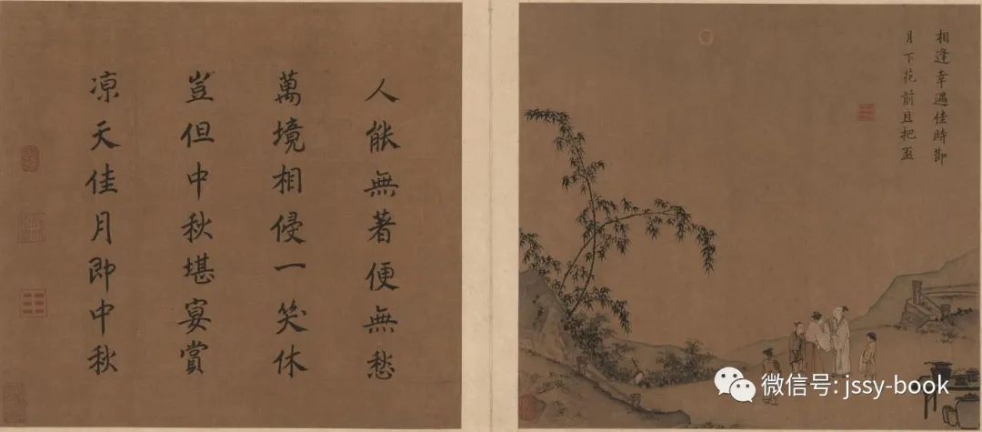 在用笔上,画家将山石扩大了斧劈凌厉的皴法,又以勾线之笔将山石润染的色墨交融,轻快直扫的用笔,以及棱角分明的点苔勾线,让人深感笔墨墨色淋漓般的畅快。马远独具魅力的勾线画风,对南宋后期院画的影响深远。马远供奉内廷,其画深得帝王贵胄们的亲赏。在绘画的章法上,马远应该说是“前无古人,后无来者”的一个重要突破。马远构图辄以“以偏概全,小中见大,只画一角或作半边景物,以凸显山林广大幽然之空间”。此图便是典型取半边景物而创作的代表传世精作。在笔者看来,这幅画除了人物外,最出彩的地方便是两竿灵动相交的清竹,画家为了打破画面的平整无奇,意将竹篁婀娜多姿的线条写得摇曳生动,使画面顿感鲜活。这就较为符合画家“写竹笔势多横斜之态”之妙姿。画上亦有较为重要的楷书诗句题跋“相逢幸遇佳节时,月下花前且把杯”,之所以说他重要,因此诗句是宁宗皇后杨氏(杨妹子)所亲书,故而就显得十分珍贵了。