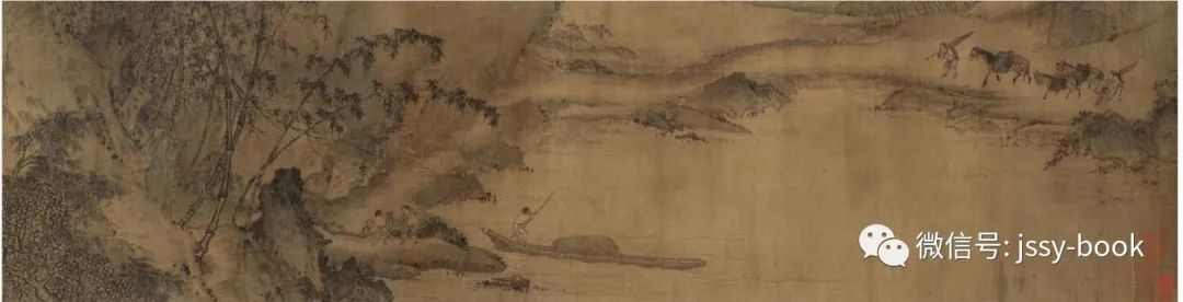 春雨富士图卷,绢本设色,纳尔逊-艾金斯艺术博物馆藏。马远的画风格独特,富有诗意。其山水师法李唐,多画江浙山水,善作平视或仰视的构图,树木杂卉多用夹笔,用焦墨作树石,石皆方硬,危崖峭壁,水色交融。