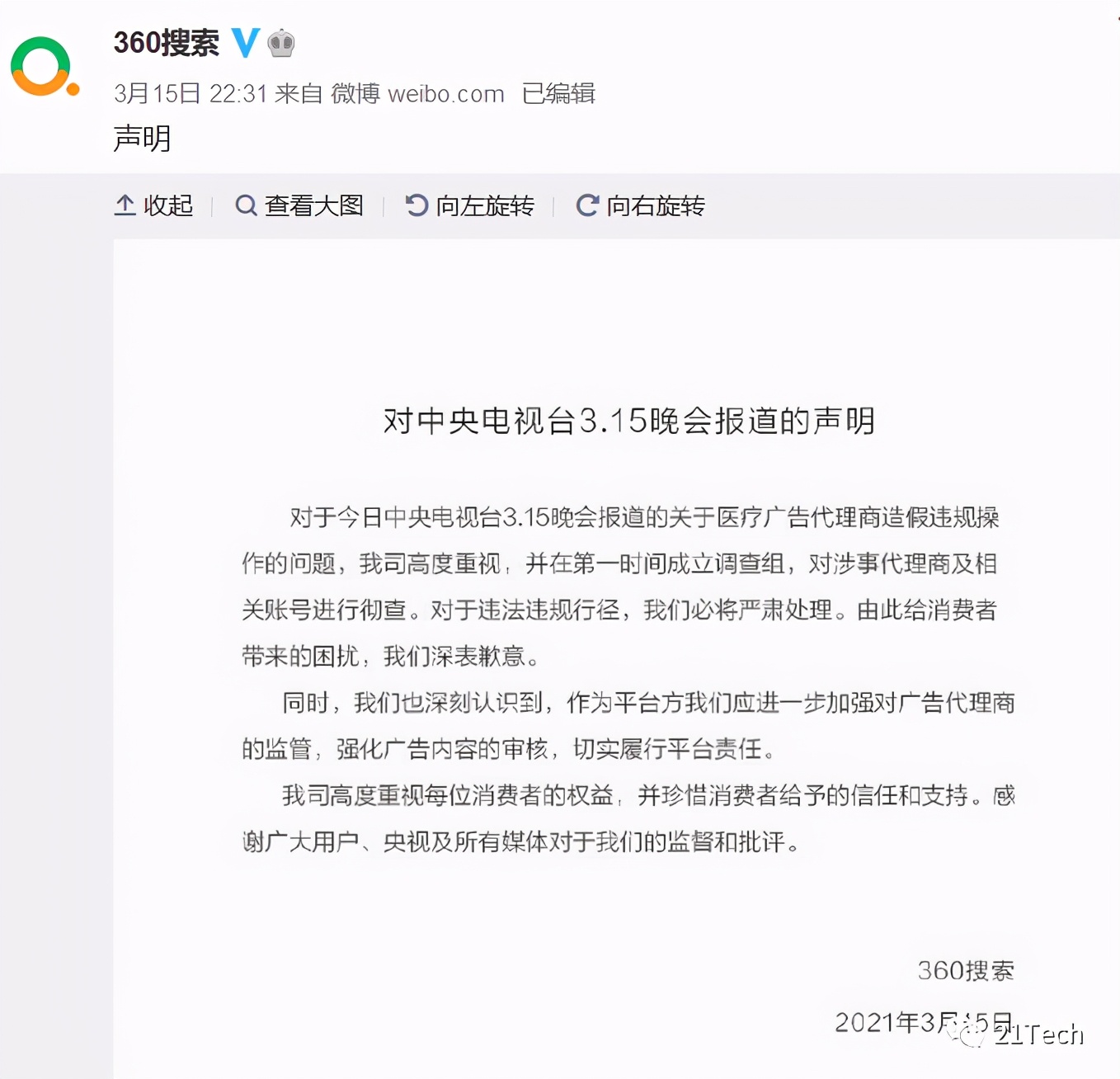 360搜索也发布声明称,对于今日中央电视台3.15晚会报道的关于医疗广告代理商造假违规操作的问题,我司高度重视,并在第一时间成立调查组,对涉事代理商及相关账号进行彻查。