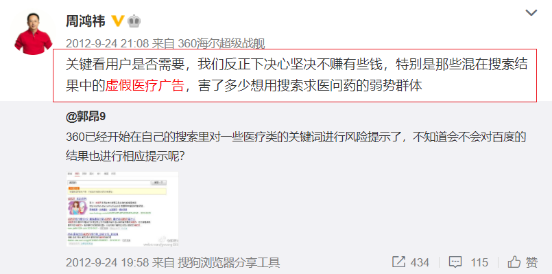 360搜索当时称,只要互联网医疗商业推广这种模式存在,就无法彻底从根本杜绝虚假医疗信息给用户带来的伤害。所以,其也呼吁所有搜索企业,在相关的法律和制度完善之前,为了生命和健康,暂时放弃商业利益。