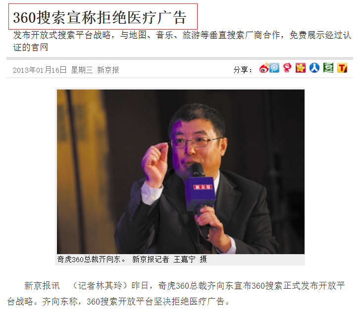 值得关注的是,随着360搜索的虚假医疗广告被曝光,网友也扒出了360在五年前做出的承诺。2016年,在百度“魏则西事件”爆发后,360搜索曾发表用户公开信,宣布从即日起放弃一切消费者医疗商业推广业务。