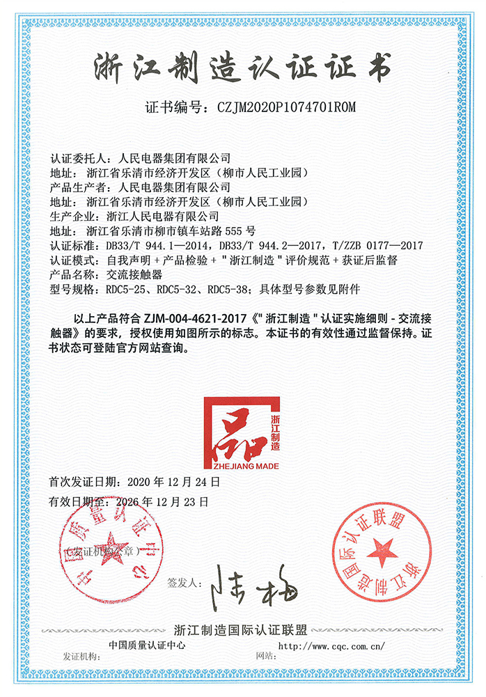 日前,人民电器集团产品:RDC5系列交流接触器获浙江制造认证证书。这是继小型断路器、万能式断路器、塑料外壳式断路器获浙江制造“品字标”公共品牌标识使用授权证书后,又一系列产品获得殊荣。
