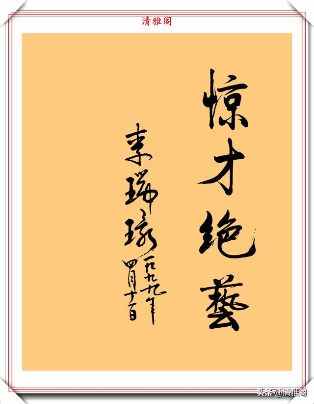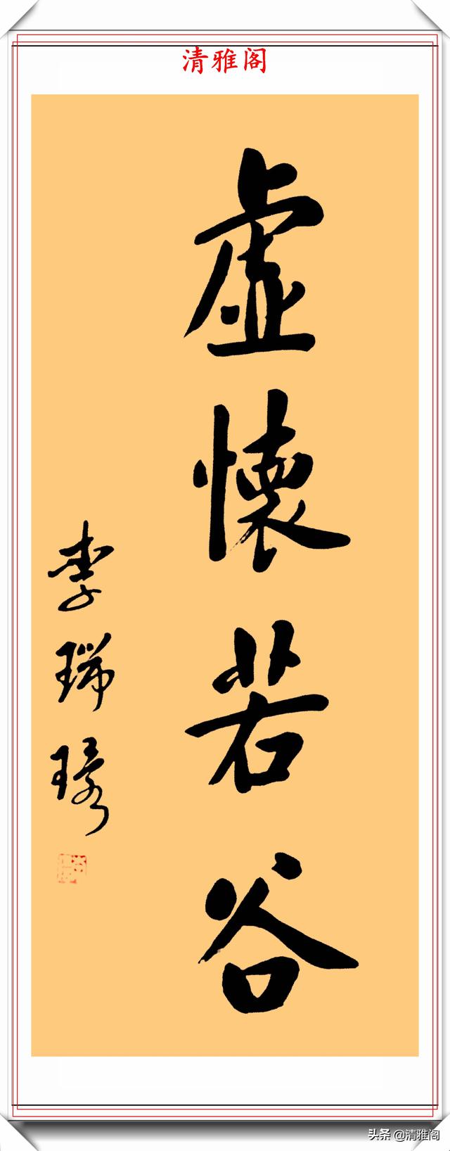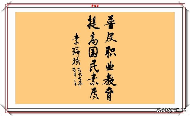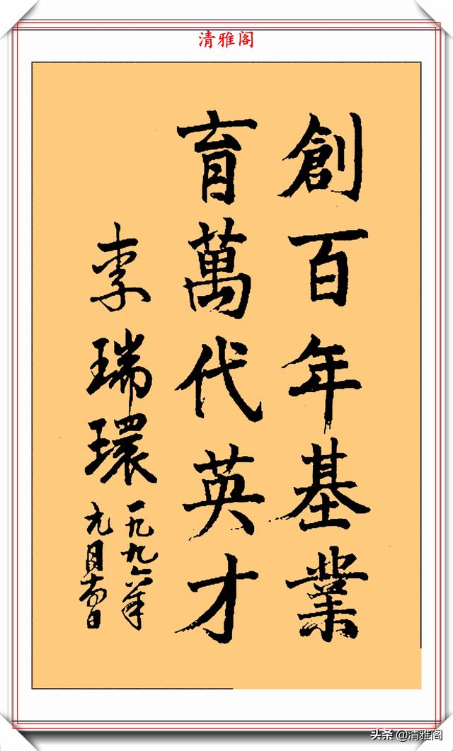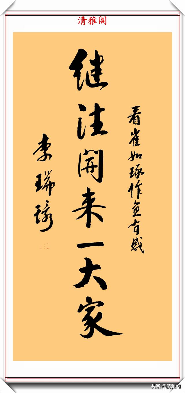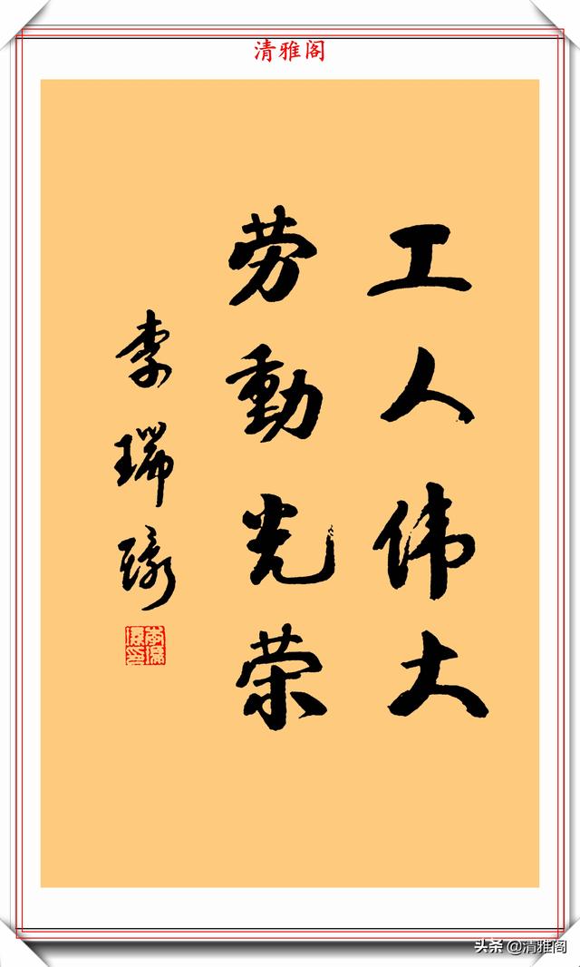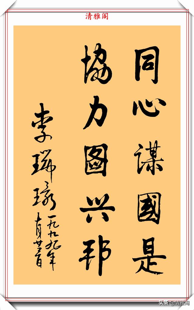 李瑞环的书法独特,洒脱,把端庄稳重的魏碑和灵活多变的行草融为一体。他的字师古而不泥,汲古而铸新,卓尔不凡,自成一家。她的书法,墩实凝重,外拙内秀,朴雅相济。不足之处是收得拢,放不开,这也许是性格使然,此作品亦如是。他的书法作品古风悠扬,气运贯通,神若清波。大开大合,功力深厚。可以说李瑞环的书法古朴灵动,收放有度,用笔自如又不失活泼,有传承有创新,笔笔苍劲有力,厚重入木三分,灵动惊若蛟龙,字形变化多幻。