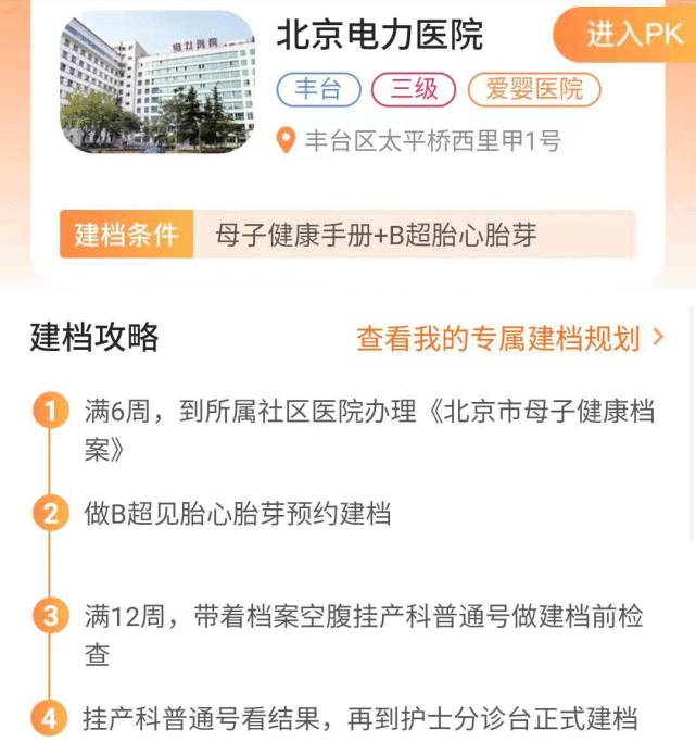 建档时间:北京电力医院是三级医院,目前建档名额充裕,建议孕8周内预约建档。