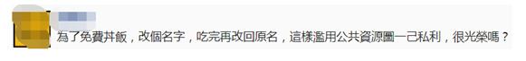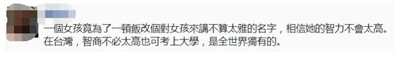 不过,也有不少岛内网友持不同意见。有人批评称,“一个女孩竟为了一顿饭改个对女孩来讲不算太雅的名字,相信她的智力不会太高。在台湾,智商不必太高也可考上大学,是全世界独有的。”↓