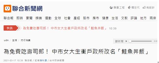 报道称,日本回转寿司“寿司郎”近日在台湾推出“爱的回鲑 寻人启事”活动活动,3月17日至3月18日只要姓名中有与“鲑鱼”同音同字者,可享免费优惠,每桌上限6人。想不到台中科技大学一位郭姓女大学生今天(17日)一早到户政部门改名叫“郭鲑鱼丼饭”。