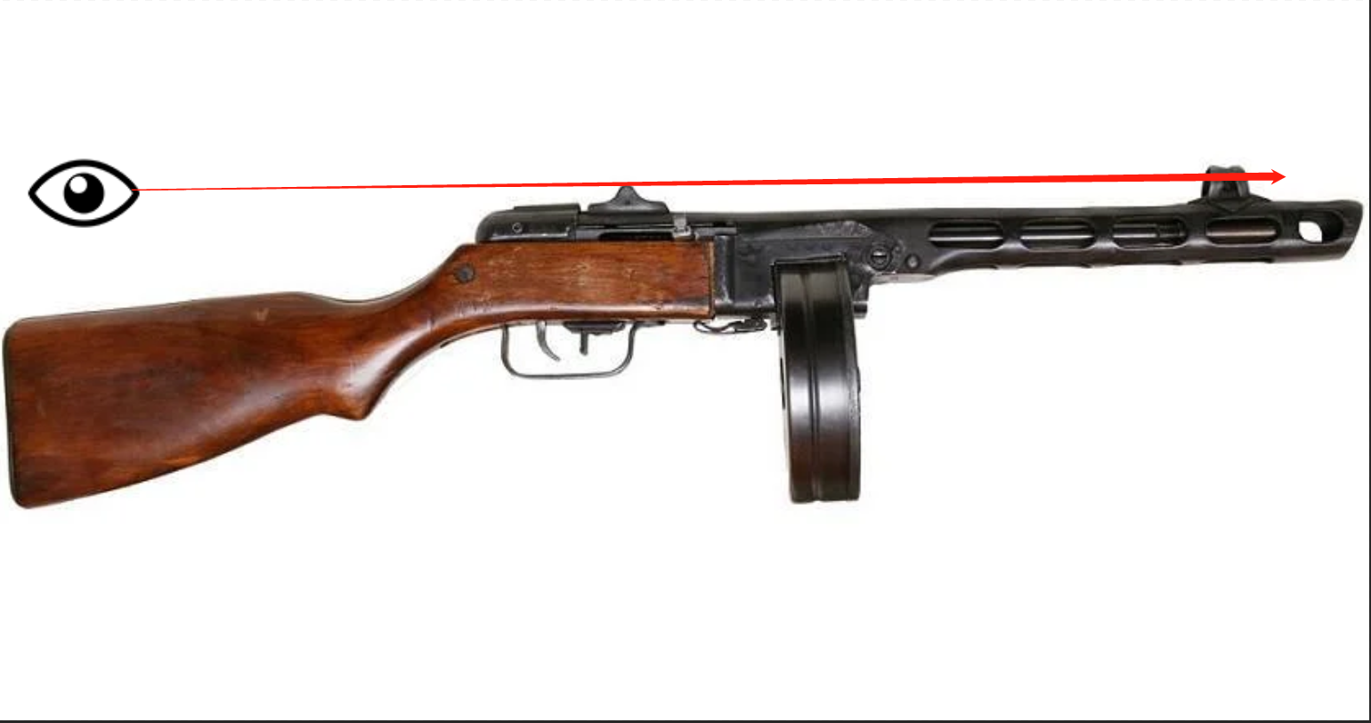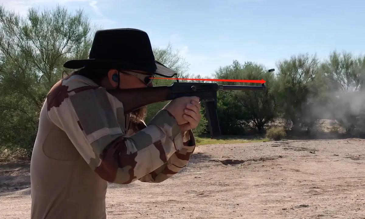 这样做的目的呢,其实是为了降低瞄准基线,抵肩射击的时候,眼睛和瞄具是有高度差的,这也是当时那些枪的枪托都向下倾斜的原因。而这把枪在设计的时候,为了降低后坐力、降低射速,复进簧是直接伸入枪托的,加长了后座距离。这就导致这把枪的枪托和机匣是平行的,往常向下倾斜枪托的方法,到他这里已经不能用了。