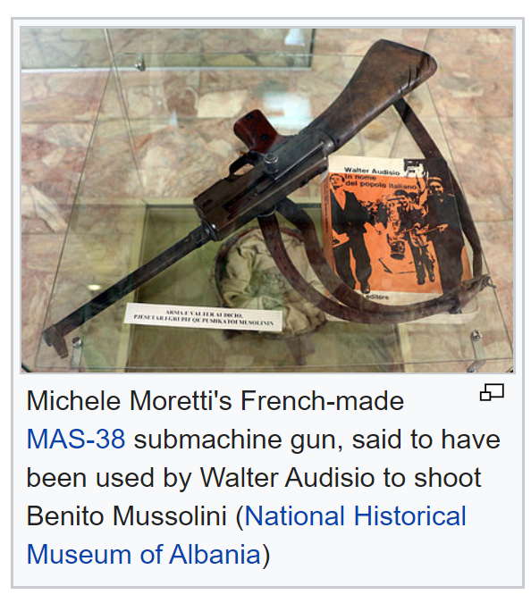 1945年4月28日,意大利法西斯头目墨索里尼在米兰被意大利游击队击毙,随后暴尸米兰街头。而击毙墨索里尼的枪支,则是法国人在二战前设计的MAS38冲锋枪。下面这把枪就是当初射击墨索里尼的枪,是原意大利游击队指挥官沃尔特·奥迪西奥送给阿尔巴尼亚的。