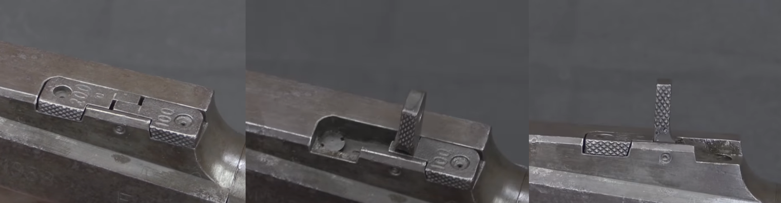 顺便说说这把枪的瞄具,它的瞄具比较有意思。MAS38的照门并不是固定凸出来一块的,以前的枪,那种表尺比较常见,但是多用于机枪和步枪,而冲锋枪用的最多的是翻转式的照门或者固定的缺口照门,照门始终都是凸起的。而MAS38的照门不同,它不用的时候,是可以折叠嵌入机匣顶端的,也是一个觇孔式照门,总共两个照门,一个100米,一个200米,用到哪个就把哪个立起来,不用的时候都折起来。法国人这么做的目的,是为了防止照门勾住一些东西。