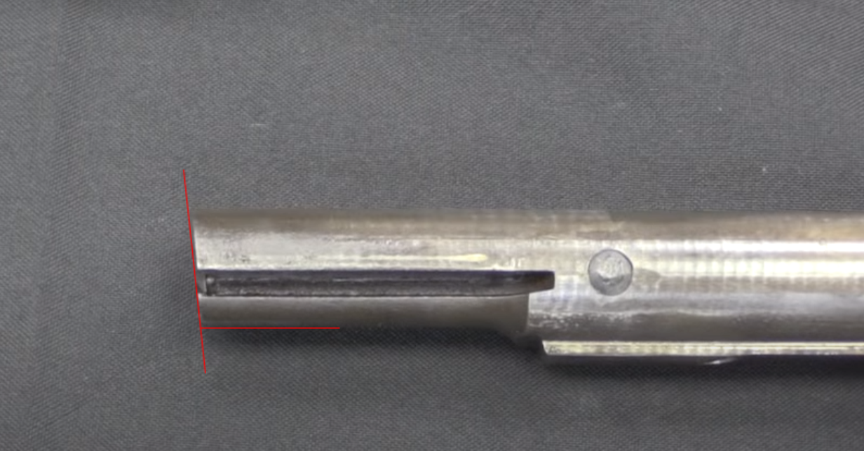 而为了使这把枪的枪机能够和枪管衔接,枪机的前端也是做了一定的角度,看上去是被切掉了一小块,目的能更好的和后膛。