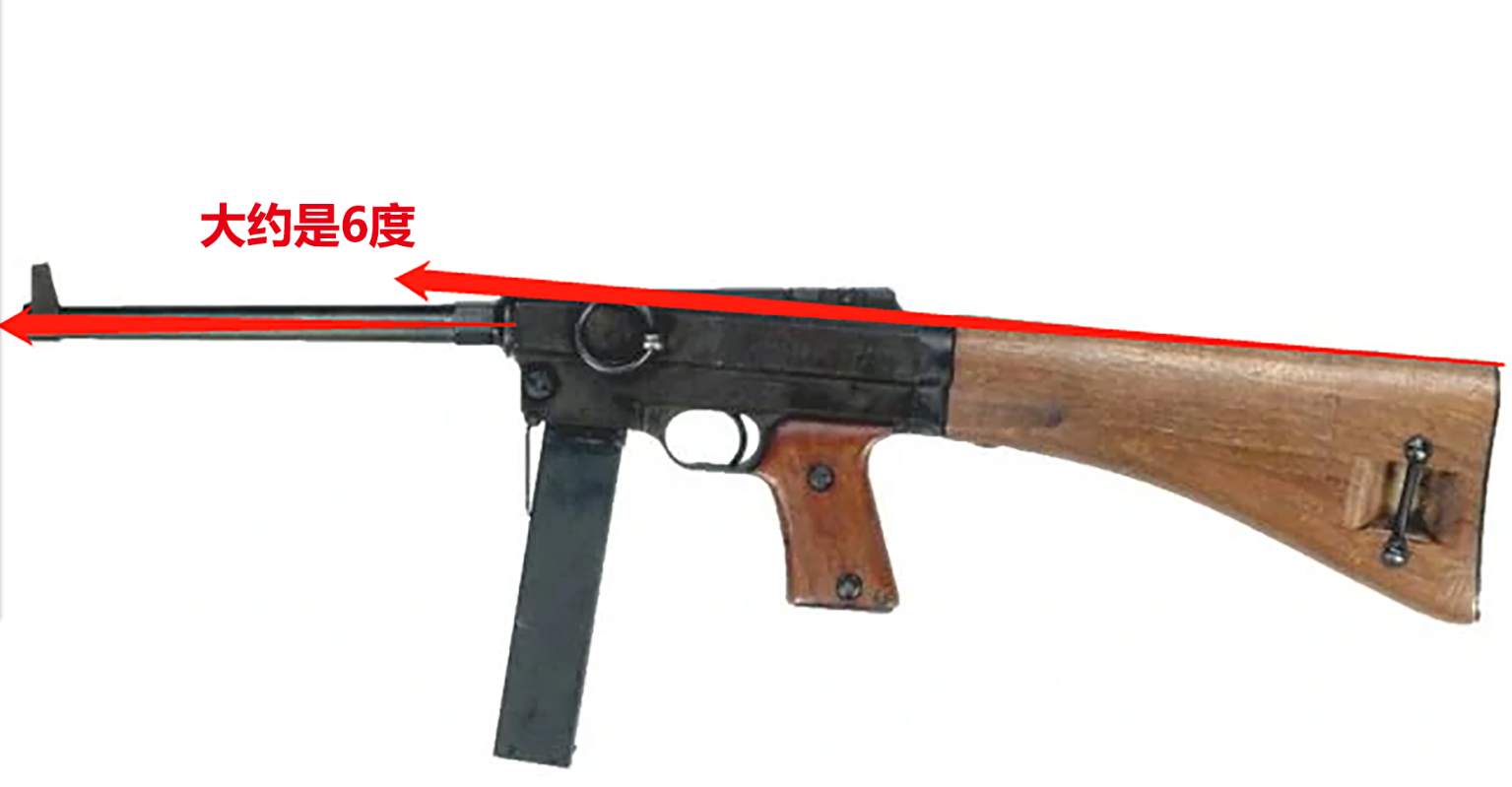 这把枪最大的特点是枪管和机匣不是平行的,枪管看上去是向下有略微倾斜的。这把枪的机匣和枪管是有大约6度的倾斜(不到6度),枪管和机匣不在一条直线上,而机匣和枪托则是在同一条直线上的。