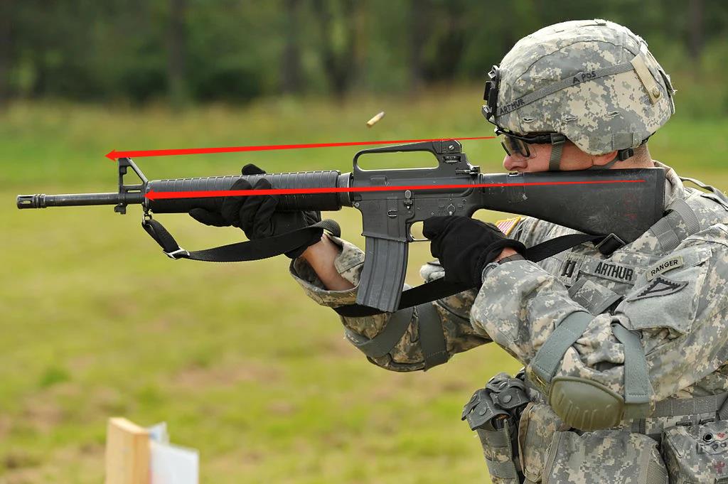 而这种枪托和机匣在同一条直线上的设计,为了让瞄准更舒适,办法往往是加高瞄准基线,就像M16那样,有个提把,照门在提把上,准星加高。(现在M4通常没提把,原因是有了皮轨,可以加瞄准镜了,高度合适,这里多说一句,喷95瞄准基线高的,基本不知道基线为什么要高)。